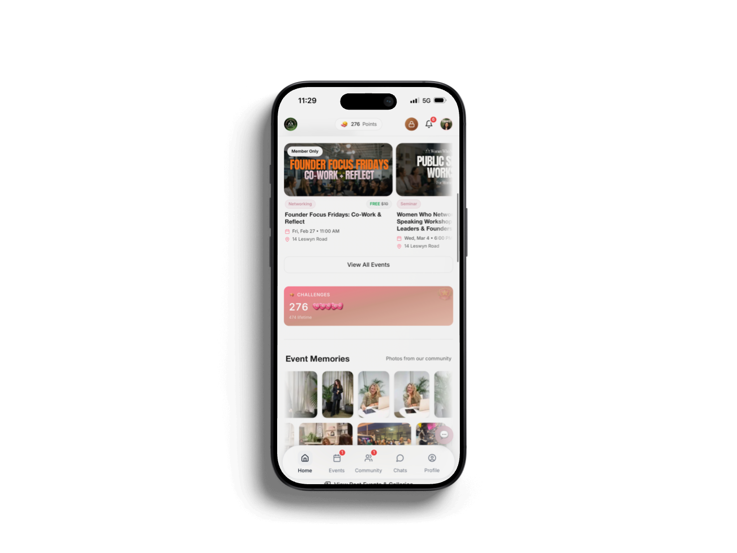 A community networking platform for women founders — events, challenges, leaderboards, private chats, coffee chats, and more.