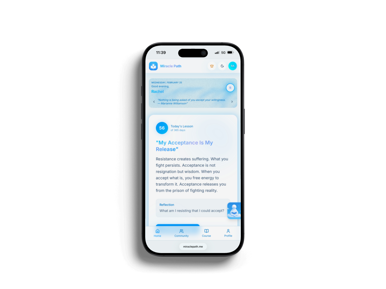 A daily spiritual coaching app based on A Course in Miracles — with weekly lessons, an AI-powered Sacred Guide, and community reflections.